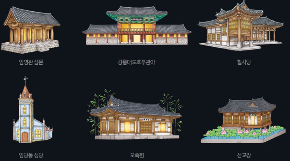 강릉 유형문화유산인 강릉임영관삼문(국보), 강릉 칠사당(보물), 강릉 오죽헌(보물), 강릉대도호부관아(사적), 강릉 임당동성당(국가등록문화유산), 강릉선교장(국가민속문화유산)과 연계한 다양한 역사문화체험의 기회가 제공됩니다.