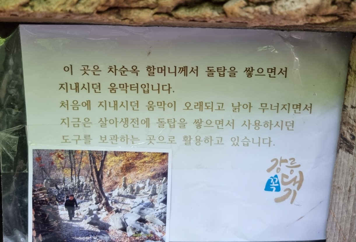 故차순옥 여사가 돌탑을 쌓을 때 기거하시던 움막으로, 심하게 훼손되어 현재의 모습은 정비된 모습입니다.