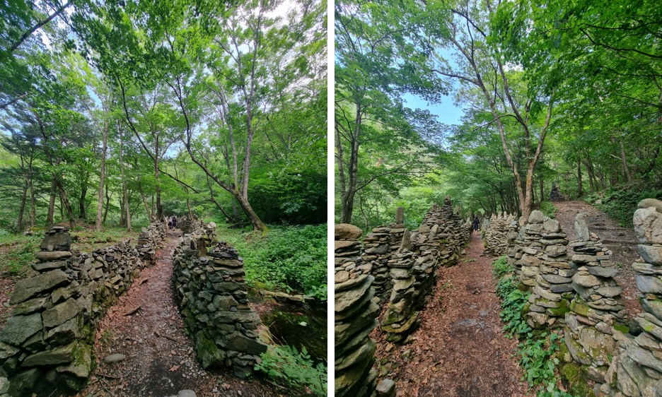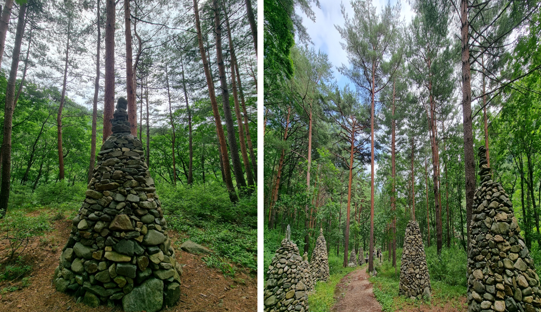 자연석 돌로 만든 원뿔 형태의 돌탑으로 0.9km 이어지면서 돌탑 길을 만들었습니다.