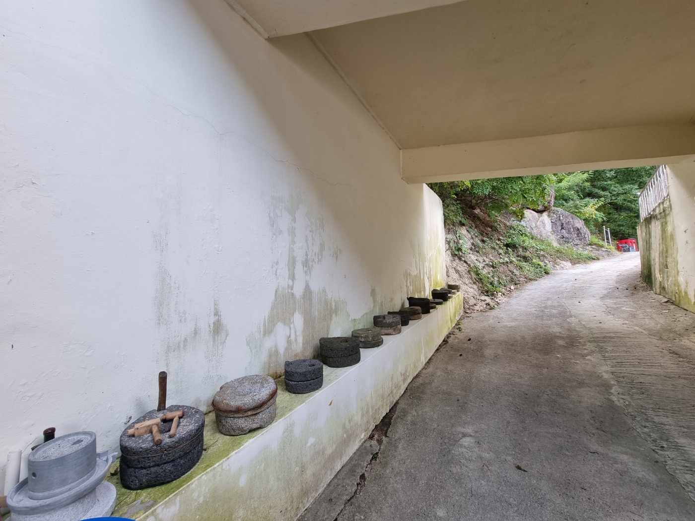 문 안쪽으로 들어서면 옆쪽으로 맷돌들이 자신을 뽐내듯 줄지어 진열되어 있습니다.