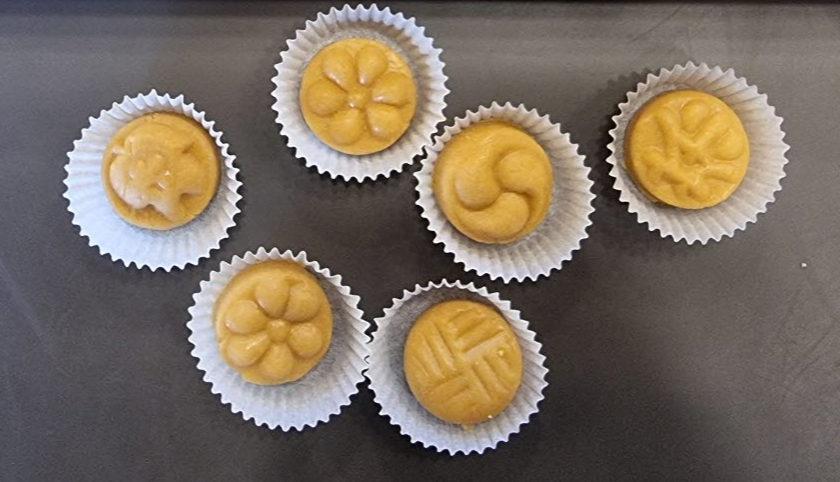 8) 준비된 다식판 틀에 적당한 양의 다식 반죽을 떼어 넣고 손가락을 이용해 꾹꾹 눌러줍니다.