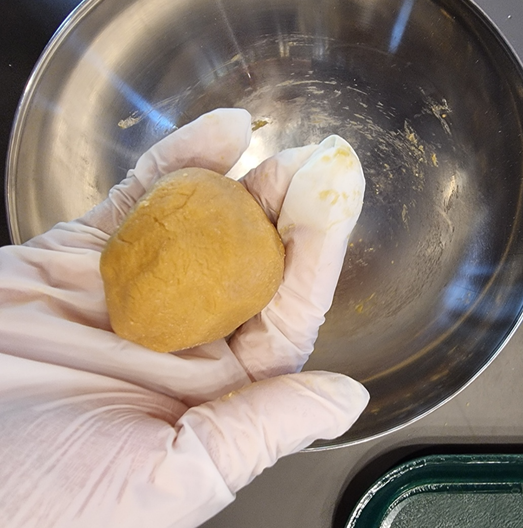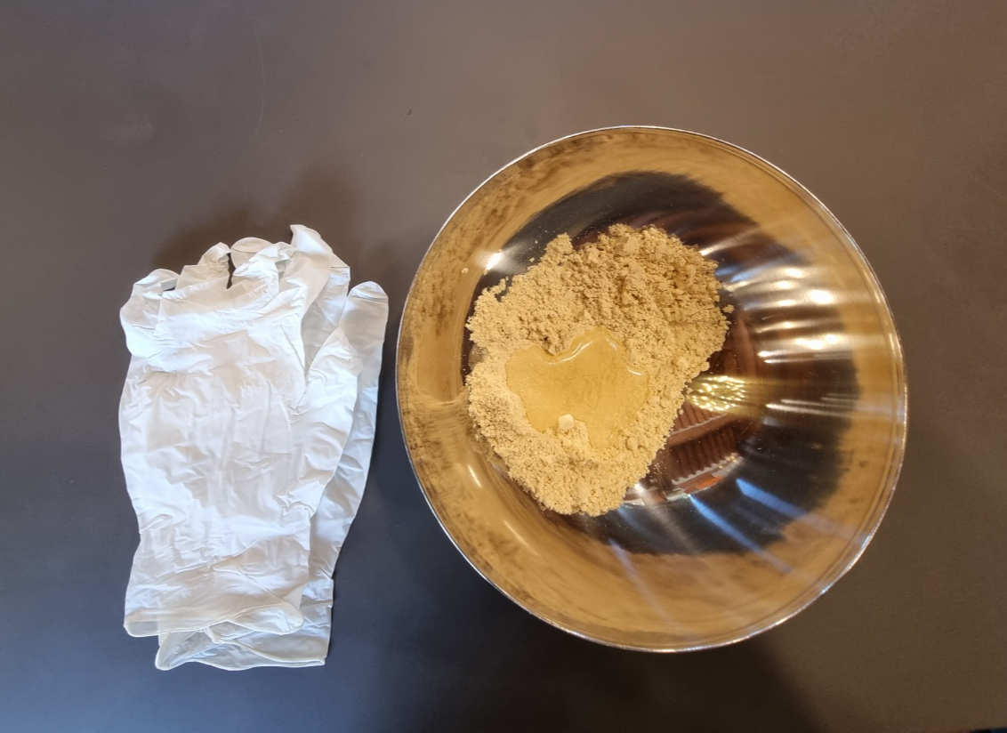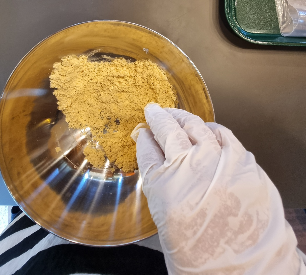 2) 장갑을 착용하고 손가락 2개를 이용해서 가루 중앙에 넣은 꿀을 주변 백태 가루로 덮어줍니다.