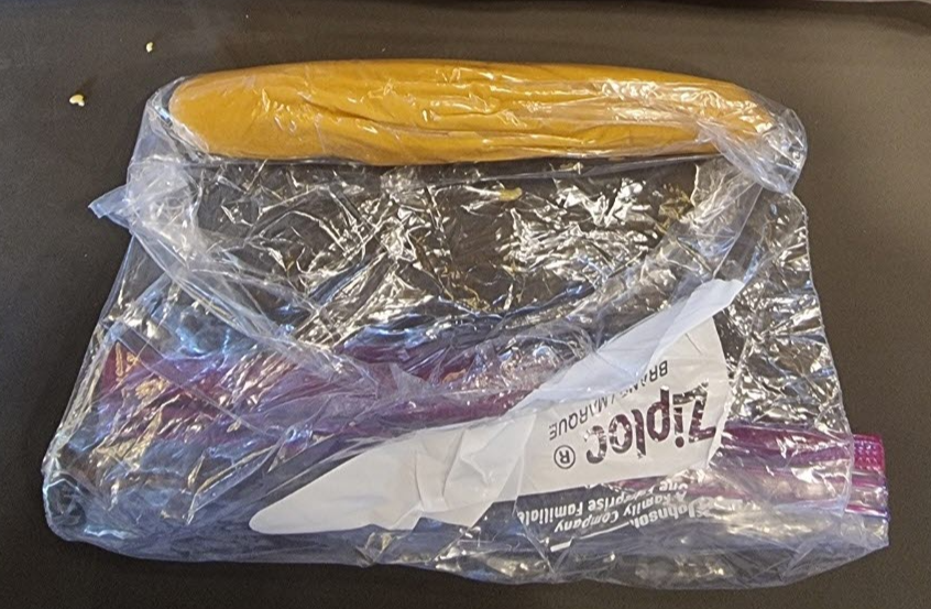 7) 반죽된 백태를 투명한 비닐봉지에 넣고 김밥 말들이 비닐을 말아 반죽을 가로로 늘려 줍니다.